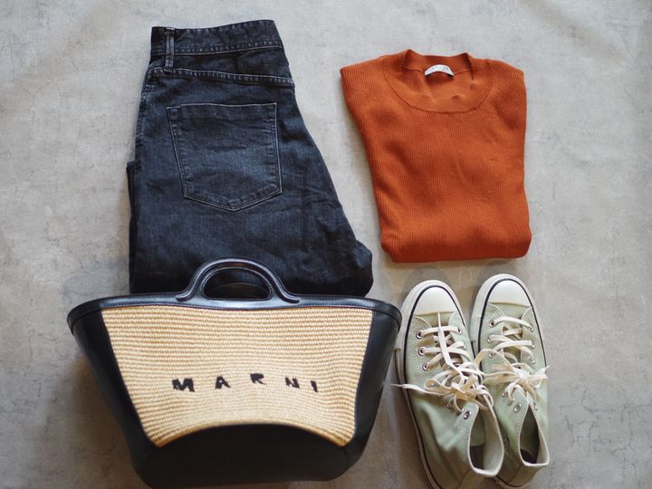 晩夏は、トップスやボトムを1つだけブラウンにして、他は夏コーデのまま着こなしてみるのはいかがでしょうか。こっくりビターなブラウンは、半袖ニットで涼し気なものをチョイス。着る時期は、やはり9月が多いのですが、かれこれ5年くらいは愛用しています。簡単でグッと秋らしくなれるのでベーシックで質のいいものを持っておくと便利です。9月上旬は、ファーバッグを持つには勇気がいる曖昧なシーズン。かごバッグの中でもロングシーズン使えるのがレザーが多く入ったかごバッグです。秋の気配がするコーデに合わせてもチグハグ感なくマッチ。