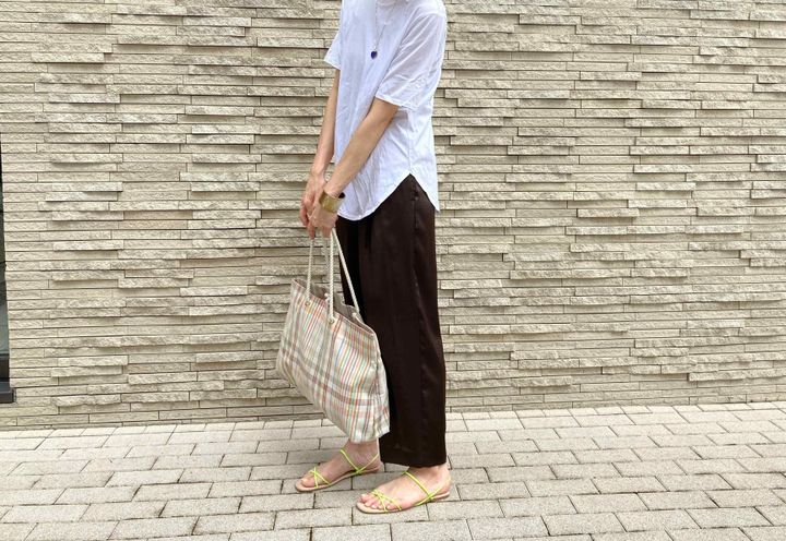 今度は、光沢感のあるサテンのブラウンパンツを夏コーデに取り入れてみました。デニムよりもシックで秋らしさを漂わせることができます。