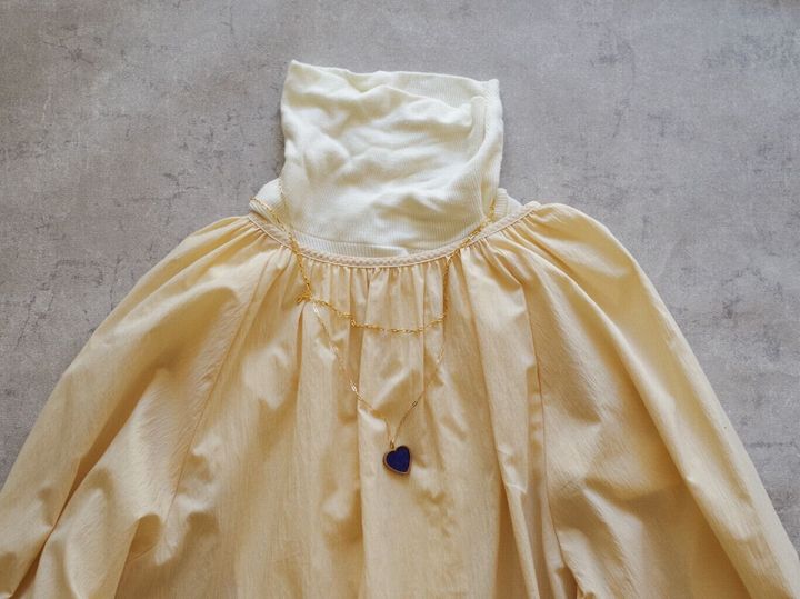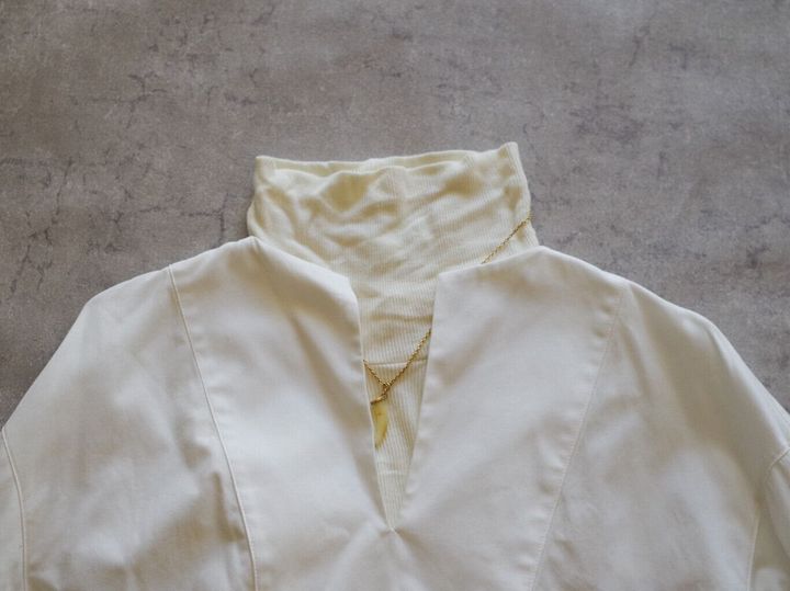 少し首元の開いたブラウスこそ、首をしっかりガードしてくれるハイネックインナーが役立ちます。ハイネックで長さが余る場合は、几帳面に折り込んだりせず、クシュッとラフに仕上げるのが素敵です。