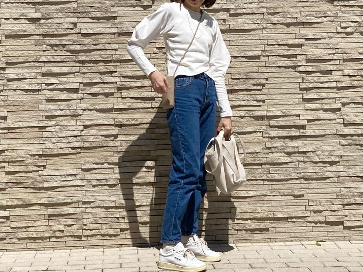 ワントーンコーデを考えるときは、何の色でもトップスの色を薄くした方が全身バランスがまとまりやすく感じます。スッキリと見せてくれる白小物は、あると便利なアイテム。バックストラップシューズできれいめにまとめてみました。