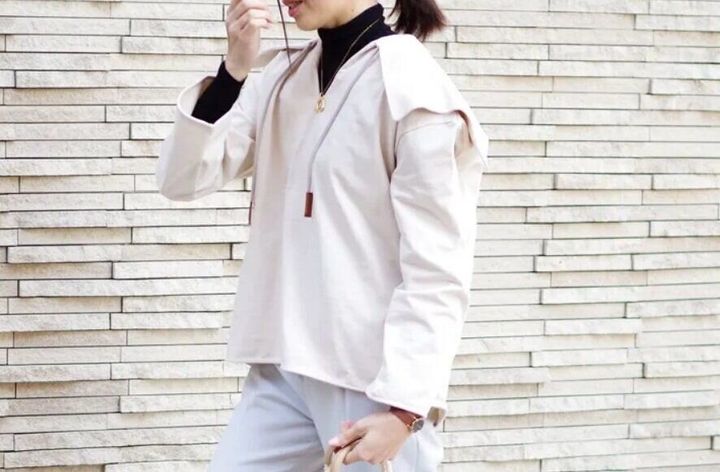今年は、手持ちの中のカットソーにもレイヤードさせています。オーバーサイズのカットソーの中に、薄手の長袖インナーを着ても窮屈感なく着られるものなら、ハイネックインナーを合わせても大丈夫なはず。ちなみに、ハイネックインナーを合わせるときには、オーバーサイズであることと、ネックラインの開き具合を気にします。オーバーサイズのボートネックカットソーだと、ピタッとしたインナーを合わせてもチグハグ感がありませんでしたよ。また、カットソーはレイヤードできるくらい少し地厚な生地のほうがいいですね。