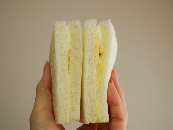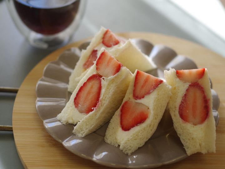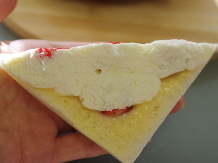 サンドイッチを2枚を2等分にカットしてみました。なかなか美しい…!一口サイズになるので、子どものおやつに出すのも素敵ですね。甘さ控えめのホイップクリームと、卵を感じるカスタード、そしてみずみずしく、ジューシーないちごがミックスされ、格別です~!言うまでもなく、子どもたちにも大人気のサンドイッチでした。