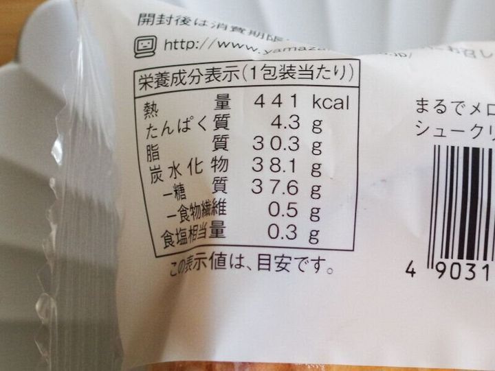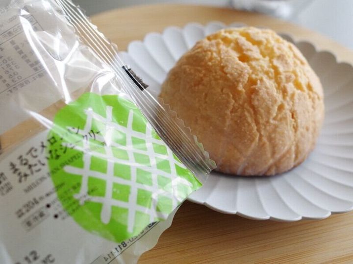 こちらが、ローソンな「まるでメロンパンみたいなシュークリーム」、220円です。シュークリームはコンビニの人気スイーツですが、メロンパンみたいなザクザクした食感のシュークリームは、あまり見かけなくて専門店のよう。パッケージのメロン柄が、店頭のスイーツコーナーでひときわ目立っていました。