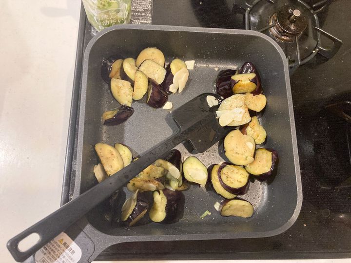なす2本を炒めました。(調味料はカルディで人気のものです!)普段は28cmの丸いフライパンを使っているのですが、ちょっとした副菜を炒めるにはちょうどいいサイズです。