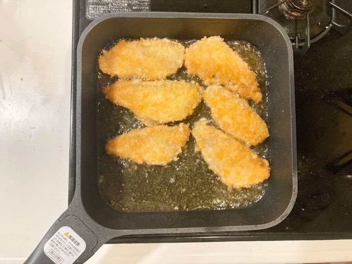 アジフライを揚げました。6枚揚げましたが、もっと入りそう。丸い形の揚げ物の鍋やフライパンよりも無駄なスペースがなく、気持ちがいいほど。
