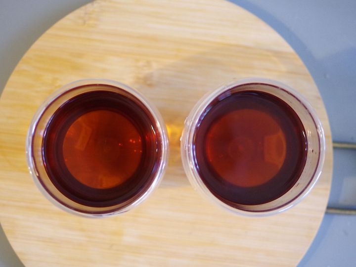 一番右がとうもろこし茶、真ん中がめんつゆ+とうもろこし茶、左がめんつゆ+水です。見た目からはそこまで違いを感じませんね。