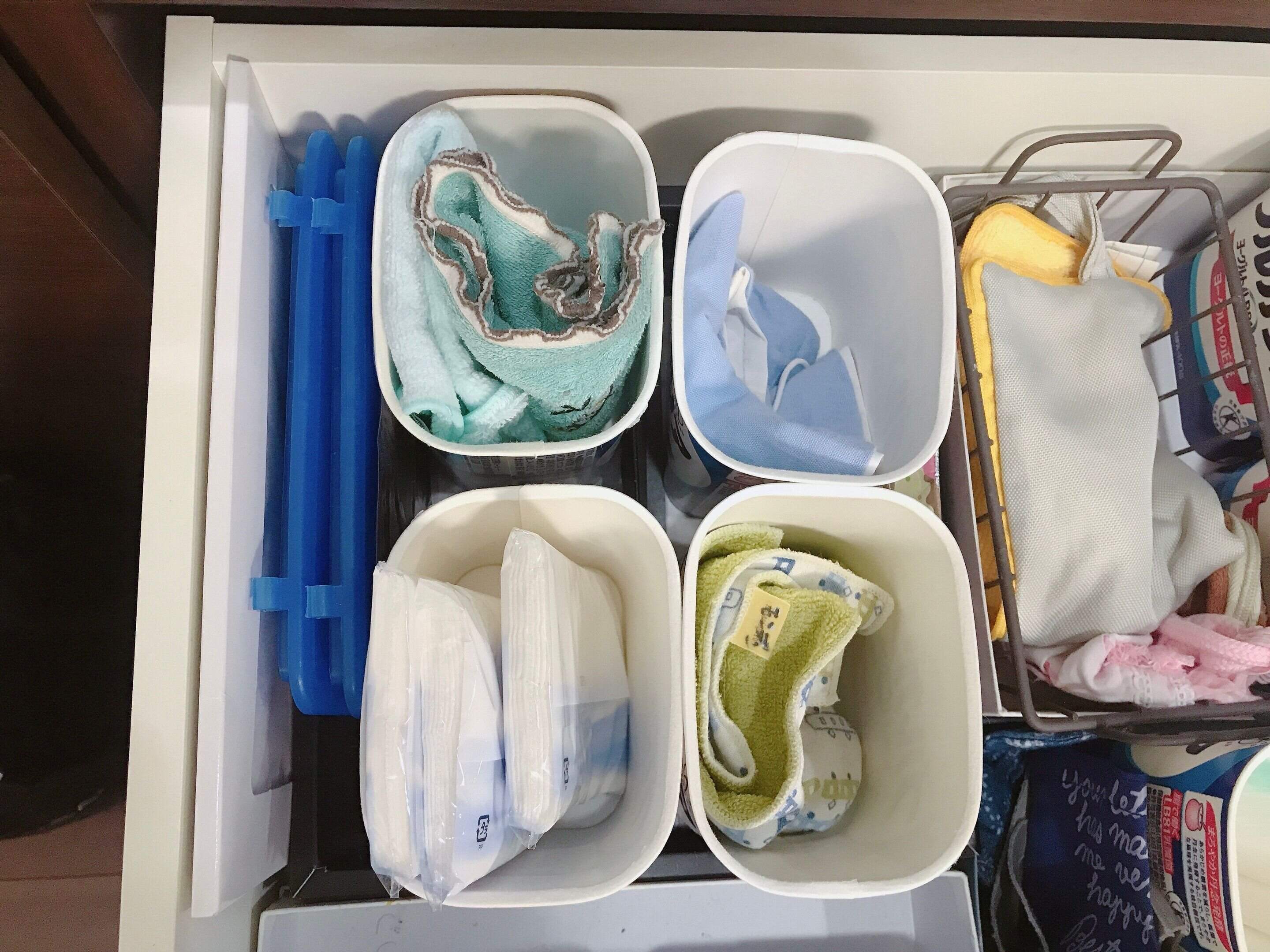 我が家では、子ども3人の朝の支度グッズ(ハンカチ、ティッシュ、マスクなど)が入っている引き出しの仕切りにヨーグルトカップを使用しています。