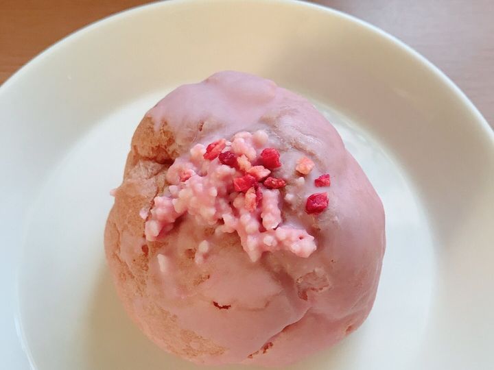 シューのトッピングにカリカリしたクランキーやドライストロベリーが乗っているので、食感も楽しむことができます。
