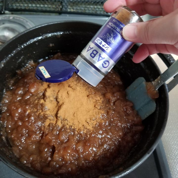 この後の為にここで私は材料を一つ追加します。シナモンパウダーです。こればかりはお好みですので、分量は味見をしながら振り入れて下さい。