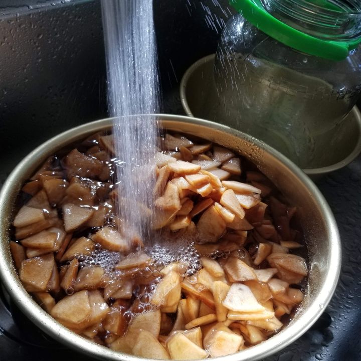 取り出したりんごは酢が強いですから、たっぷりの水に一晩浸けて酢を抜きます。私は待つのが嫌だったので、午前中の2~3時間だけしかつけませんでした。