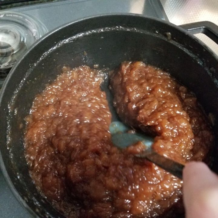 一時間ほど煮ていくとだいぶかさが減って、とろとろに煮込まれていきます。あまり煮込み足りないと水分が多くなってしまいますし、煮込みすぎると冷えた時に飴のように固くなってしまいます。