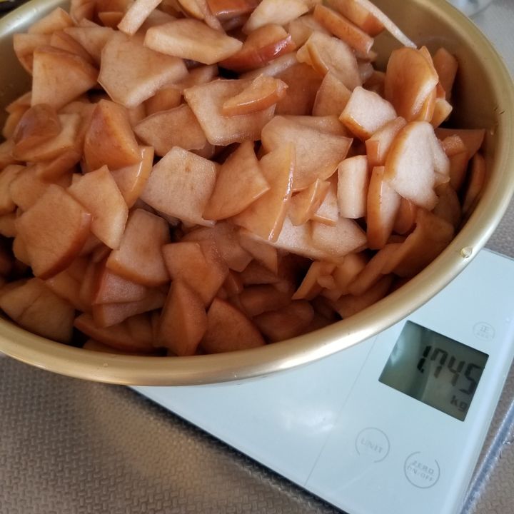 ぎゅうっと手でりんごの水分を絞り、グラムを計りましょう。今回はおよそ1.8kgでしたので、用意する砂糖は360gぐらいです。お好みで砂糖の量は調節して下さいね。