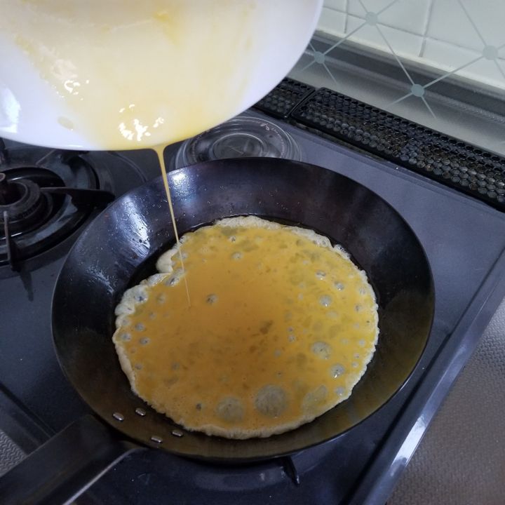 ゴオオと熱したフライパンに多めのごま油を入れ、溶き卵を流し入れ…。