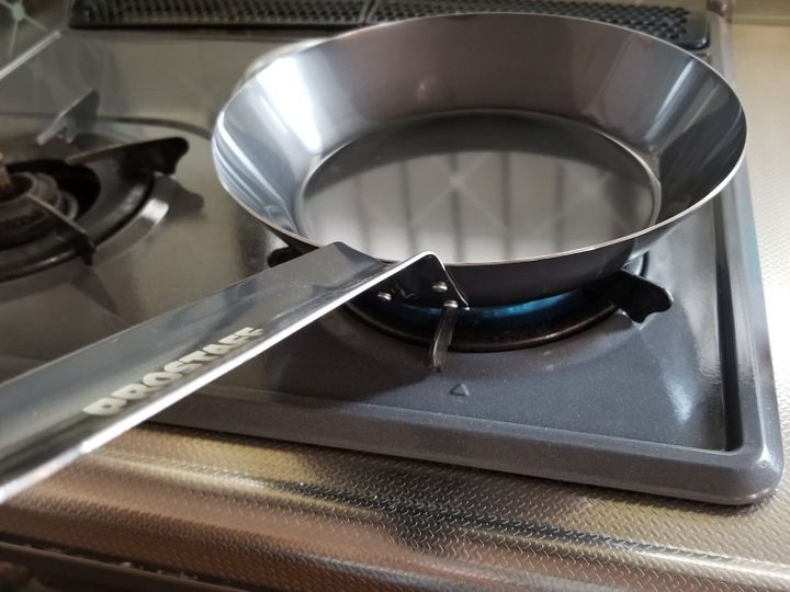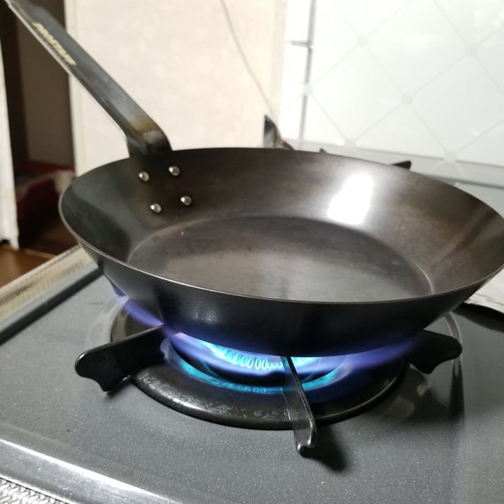 最初はひたすらに業火にかけます。説明書が付いていたのでその通りにまず『空焼き』をして出荷時のさび止めを落とすそうです。必要のない鉄のフライパンもあるようです。