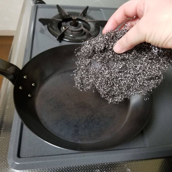 我が家では金たわしを使って汚れやこびりつきを落として火にかけ、油を塗ってお手入れ終了です。最初にフライパンを洗って火にかければ、他のお皿を洗っている間にすっかり水分は飛びます。もうすっかり後片付けのルーティーンになり、面倒くささは感じていません。