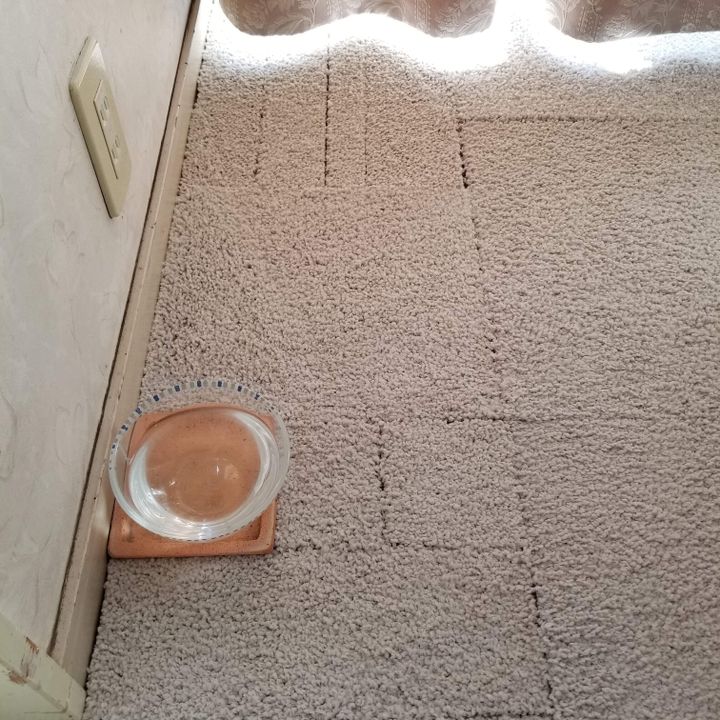 カットした切れ端で、上の画像のような水飲み置き場のところだけ省いて敷くことも出来、タイルカーペット3枚分程の節約になりました。