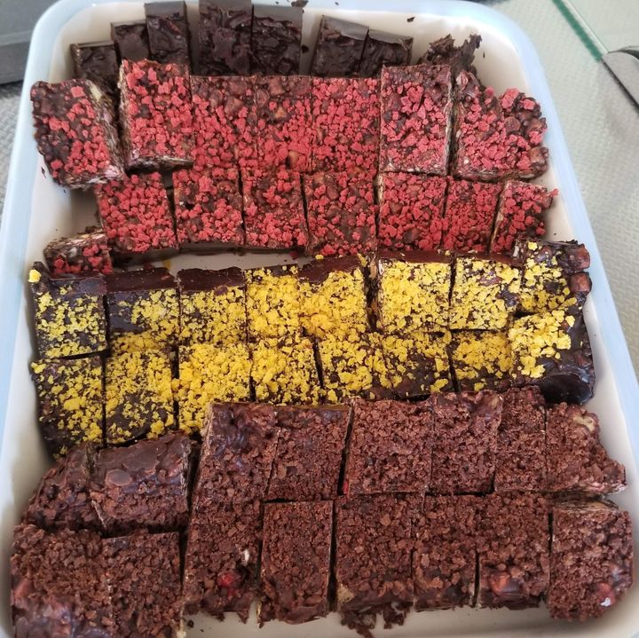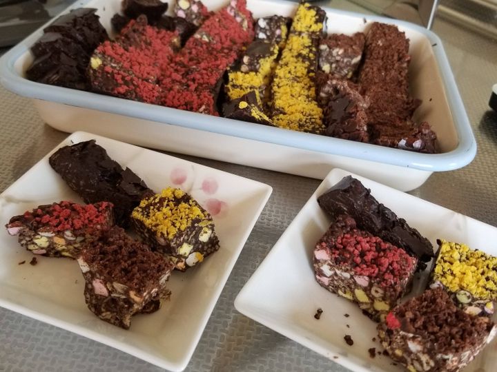 チョコを溶かして、材料を混ぜて型に入れ、上にカラフルな材料を乗せて押し冷やし固めるだけです。