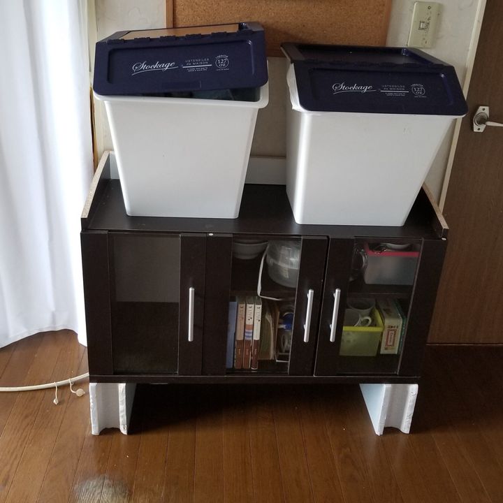 うちは犬がいるのでゴミ箱を下に置くことができません。そこで思いついたのが食器棚の上半分。これで低い位置の収納が可能になり、更にゴミ箱を上へ乗せることも出来ました。