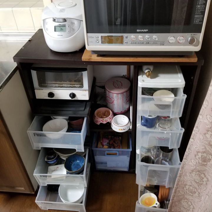 プラスチックの引き出しはすぐに飛び出してしまいそうです。あんな高さから炊飯器やレンジが落ちてきたら…ぞっとします。