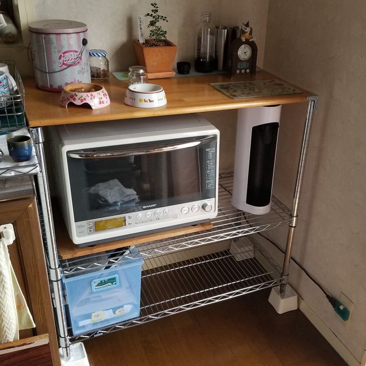 代わりにシェルフを買い、好きな高さに調節してレンジを一段低い位置へ移動。炊飯器はストウブ鍋へと姿を変え、トースターは魚焼きグリルで代用することにしてどちらも処分しました。