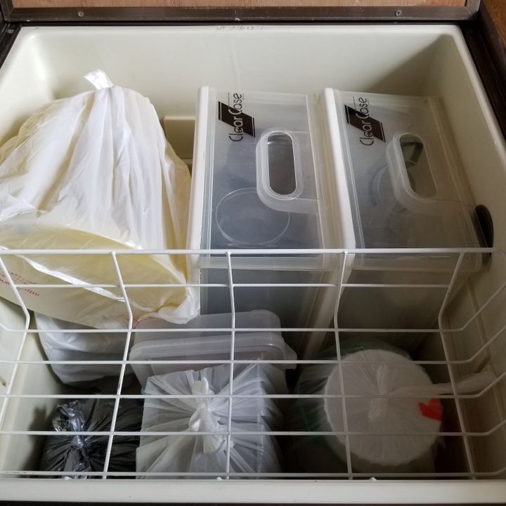 ここは主にレシピ、書類、2軍の食器、ゴミ袋などを置いています。