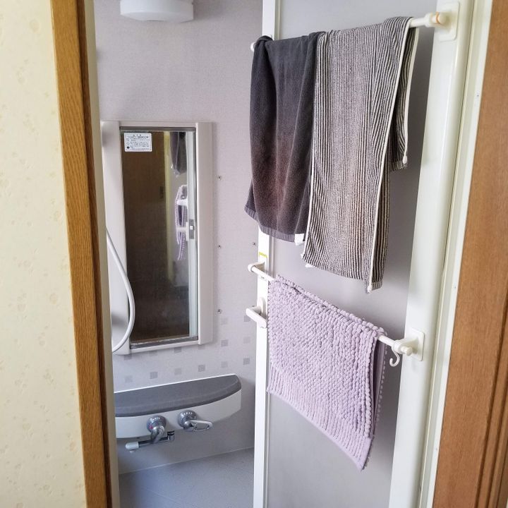 我が家にはお風呂のドアにバスタオルをかけるものが付いていなかったので、住んで5年、随分試行錯誤して、今はとっても快適なお風呂ライフをおくっています。