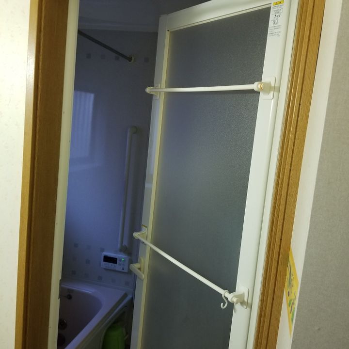 お風呂のドア枠だけに突っ張り棒をしましたが、かけられる量が少なすぎて、これはすぐやめてしまいました。