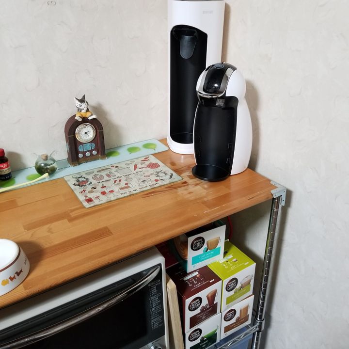 棚の一番上にマシンをまとめたことで、ドリンクスペースみたいになってちょっとお気に入りの場所になりつつあります。炭酸マシンに色を合わせたドルチェグストのマシンがまたペンギンみたいで可愛らしいのです。