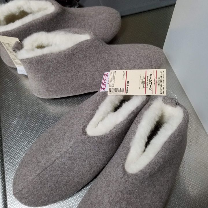 ファイルボックスが欲しくて無印良品に立ち寄ったのですが、まだ冬はこれからだというのにブーツ型のスリッパが半額でした。