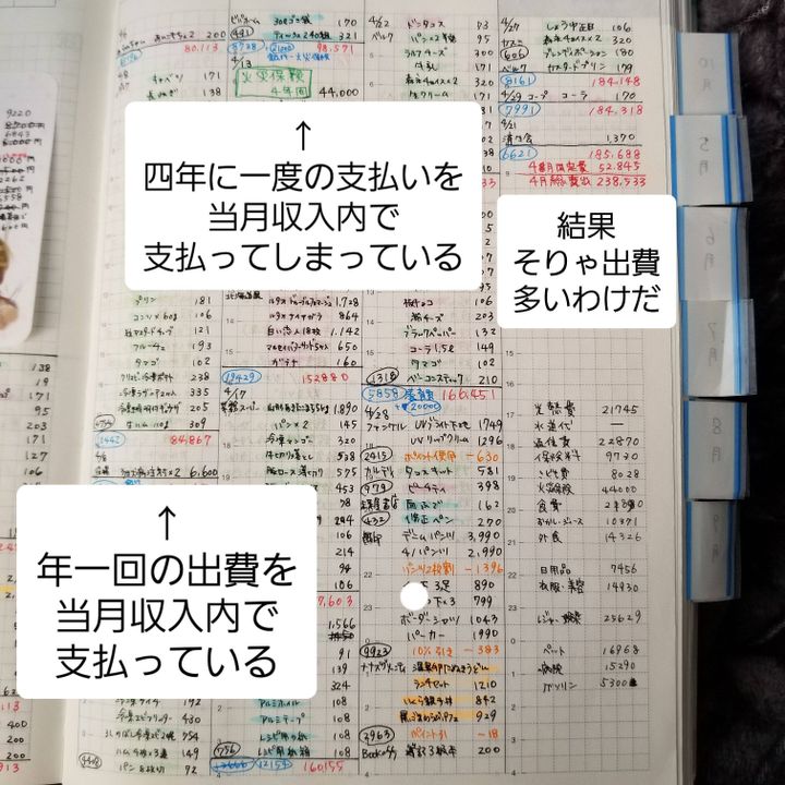 また、四年に一度だろうが、一年に一度だろうが、この月に支払うものはこの月の出費として計上していた為、月によって出費が大幅に違い不安定な家計簿です。