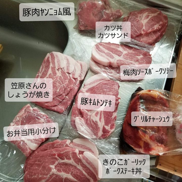 そうしてもう少し厚めに切って、豚キムチ、ポークステーキ、ポークソテー用に切り分けます。更に厚く切ってカツ用にします。