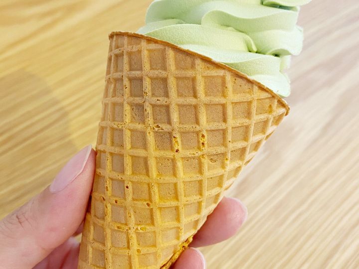 ワッフルコーンは甘くそれだけでも十分おいしくいただけますが、甘さ控えめでほろ苦い抹茶アイスと合わさると絶妙なバランス!