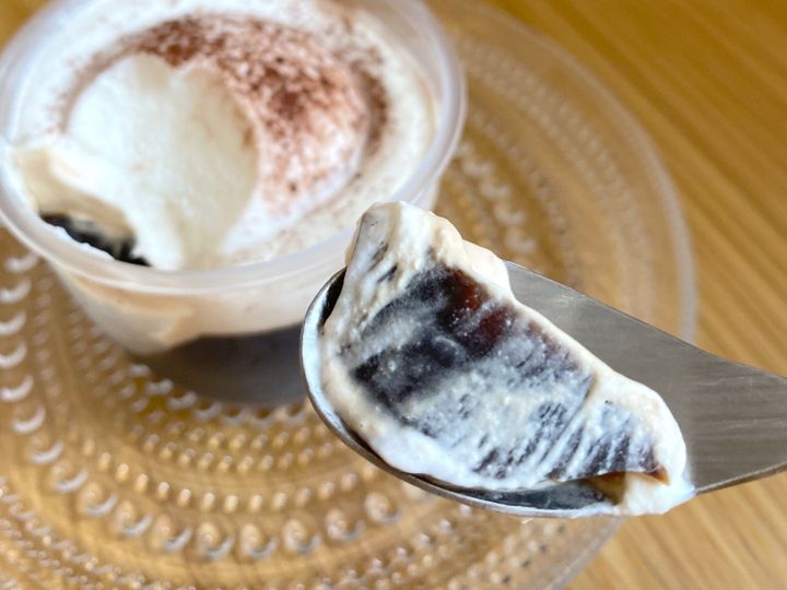 下層からコーヒーゼリー、クリーム、練乳入りムース、ココアパウダーとなっています。