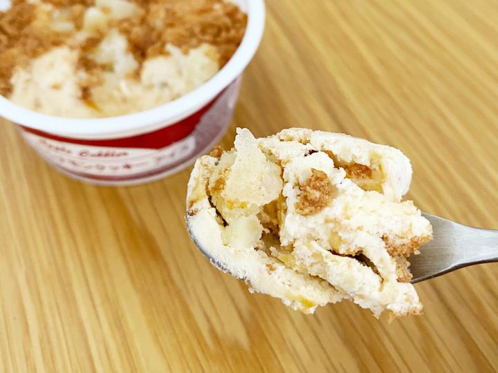 ビターカラメルソースが入ったカスタード風味アイスに、シナモンクッキーとシロップ漬けりんごがトッピングされています。