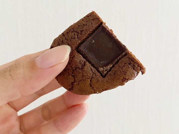 ブラウニーの表面は焼きチョコのサックリ食感で、中は柔らかくしっとりとしています。キューブチョコレートはゴリゴリと歯応えのあるタイプで、口の中で徐々に溶けていきカカオの風味と甘さがひろがります。しっとり程よい甘さのブラウニー生地とキューブチョコレートが混ざり合い、口の中がチョコまみれに〜。チョコ好きにはたまらない至福のひとときです!