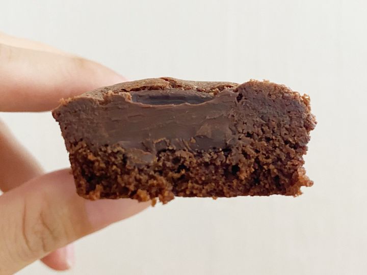 冷やして食べてもおいしいとのことでしたので、4分の1ほど冷蔵庫で1時間冷やして食べてみました。冷やすことでチョコレートがギュッとしまり濃厚さが増し、よりスイーツに近い味わいに変化します。全体的に食感がかたくなるので食べ応えも抜群です。