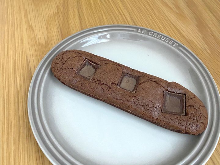 直径19センチのお皿にピッタリおさまるサイズのスティックタイプのブラウニーです。表面にはキューブチョコレートが3つトッピングされています。