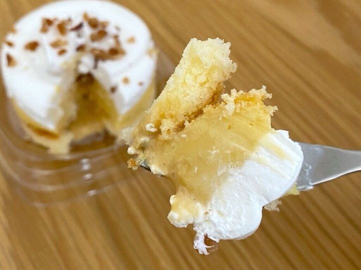底面からスポンジ、生スイートポテト、ホイップクリームと層になっていて、トップにはアーモンドがトッピングされています。外側からは見えませんが中にはカラメルバターソースが入っています。
