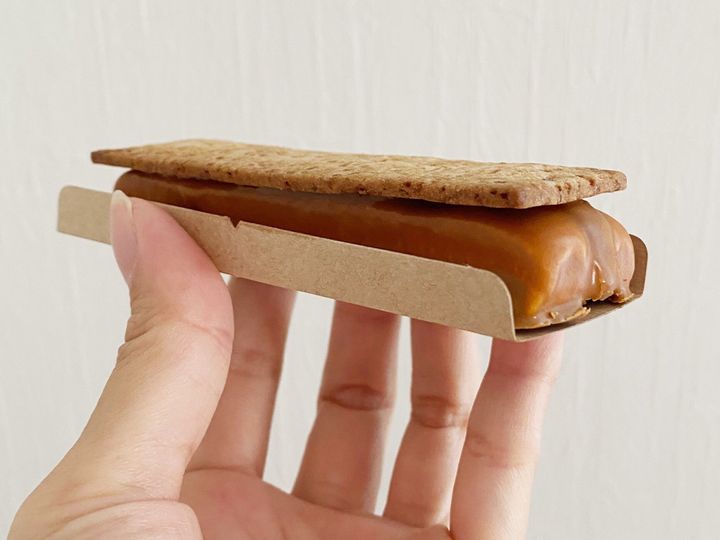 ほろ苦いキャラメルソースが入ったキャラメルクリームをキャラメルチョコでコーティングし、2枚のビスケットでサンドしたスイーツです。