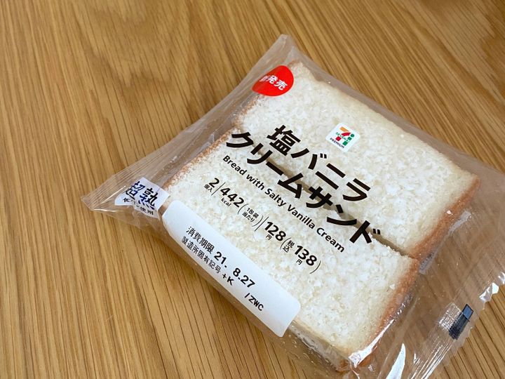 6枚切りの食パン2枚で塩バニラクリームがサンドされています。端のほうまでたっぷりとクリームが入っているところがうれしいです。上面には砂糖がトッピングされています。