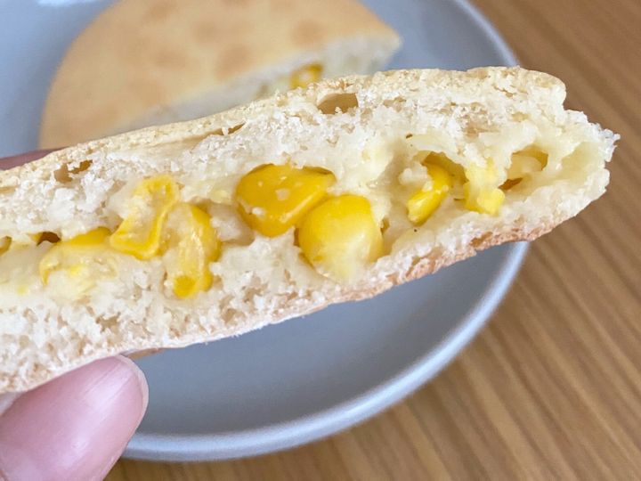 表面にサックリとした生地をのせて焼き上げたパン生地に、つぶつぶのスイートコーンとコーンクリームが入っています。