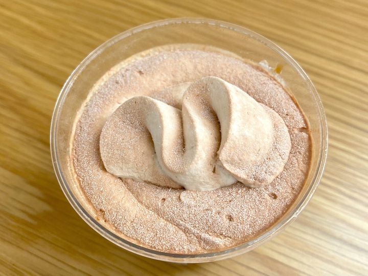 紅茶シロップを染み込ませたスポンジとマスカルポーネムースを2段重ね、その上に紅茶風味のホイップクリーム、トップには紅茶パウダーがふりかけられています。