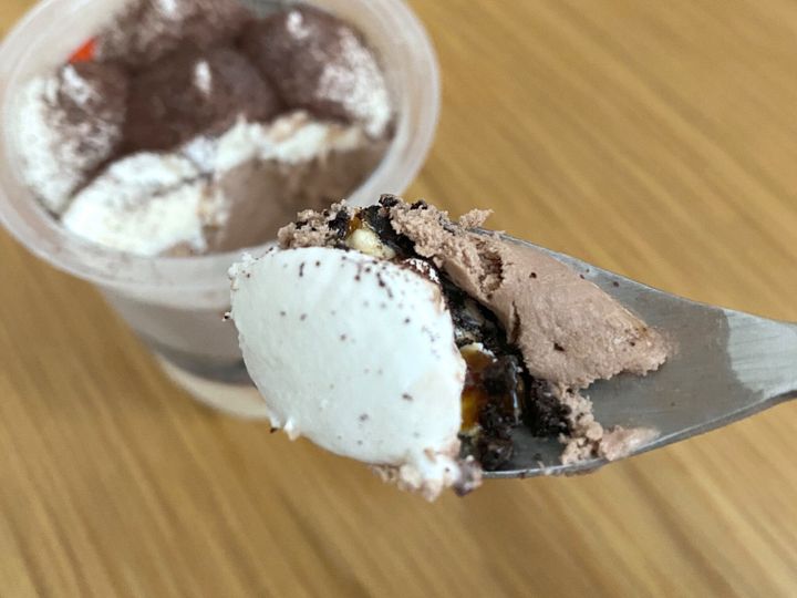 マスカルポーネ味ホイップはマスカルポーネの味はあまり感じませんがフワフワでミルキーな味わいです。カカオニブ入りコーヒーアイスはビターなコーヒーの風味でカカオニブのパリパリ食感を楽しめます。コーヒーシロップの染みたココアクッキーは、しっとりしていて冷えた口の中を癒やしてくれる存在。マスカルポーネ味アイスはほんのりマスカルポーネの風味でコクがある甘さです。