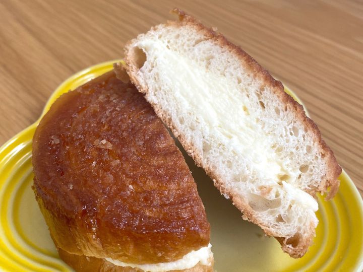 表面をカラメリゼしたデニッシュ生地にコクのあるクリームをサンドした菓子パン。