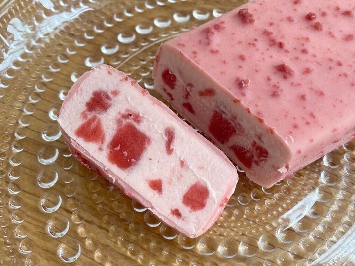 噛むたびに口いっぱいにいちごの香りが広がり、最初から最後までいちごを堪能できるアイスです。