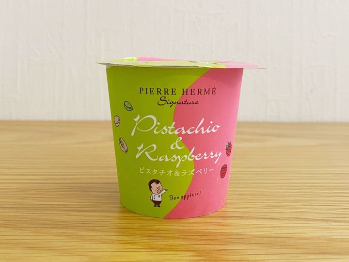ピスタチオとラズベリーを合わせた、口どけなめらかなカップアイスです。