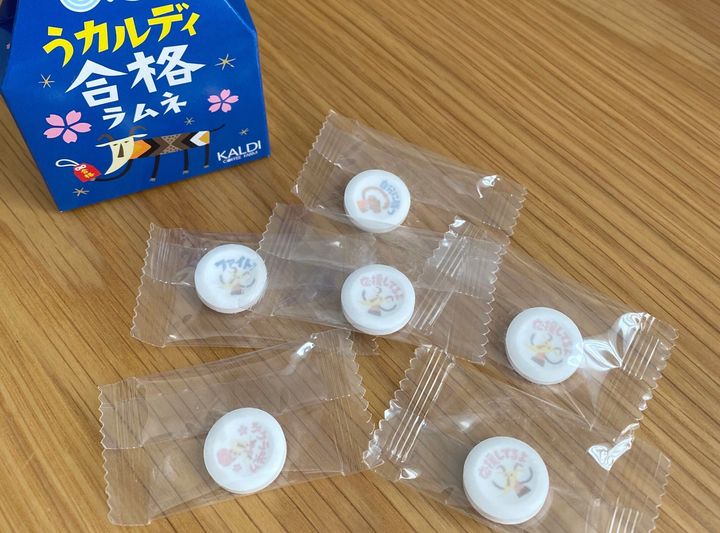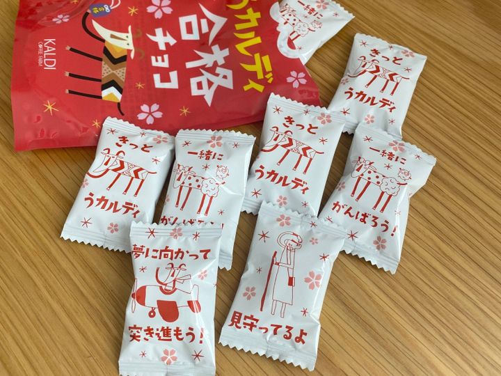 「きっとうカルディ」「夢に向かって突き進もう!」「超大吉」「合格祈願」「応援してるよ!」など、受験生を応援するポジティブな言葉が書かれています。