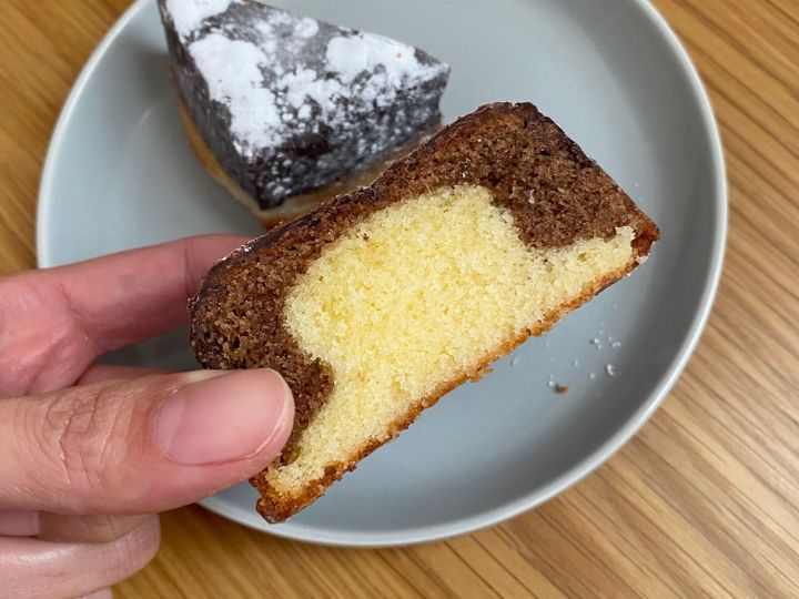 ほろ苦いコーヒー生地と濃厚なチーズ生地の2層の生地を、かためのチョコレートでコーティングした焼菓子です。