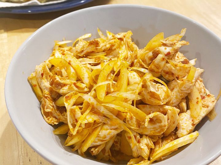 火を通したササミと長ネギを食べやすい大きさにカットして旨辛醬と和えると、ビールに合うおつまみの完成。