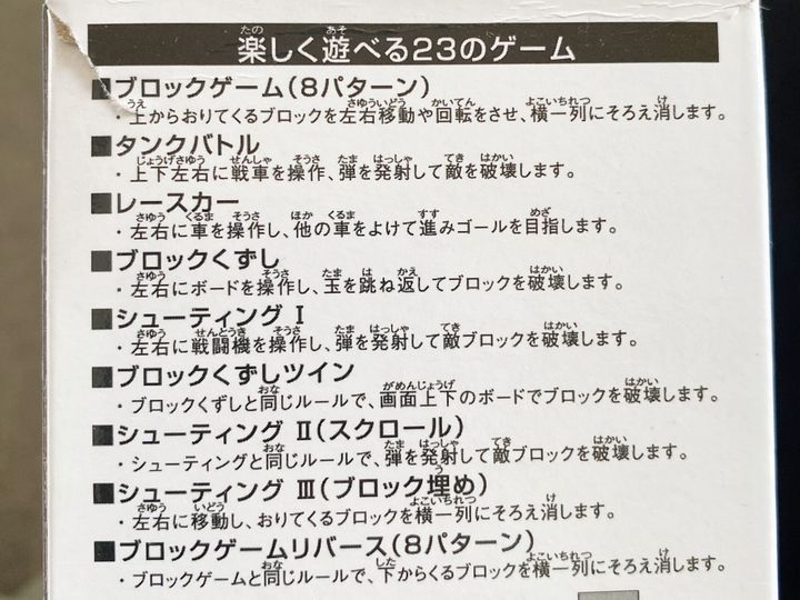 ブロックゲームやレースカー、シューティングゲームなど8パターン、23のゲームを楽しめるゲーム機です。